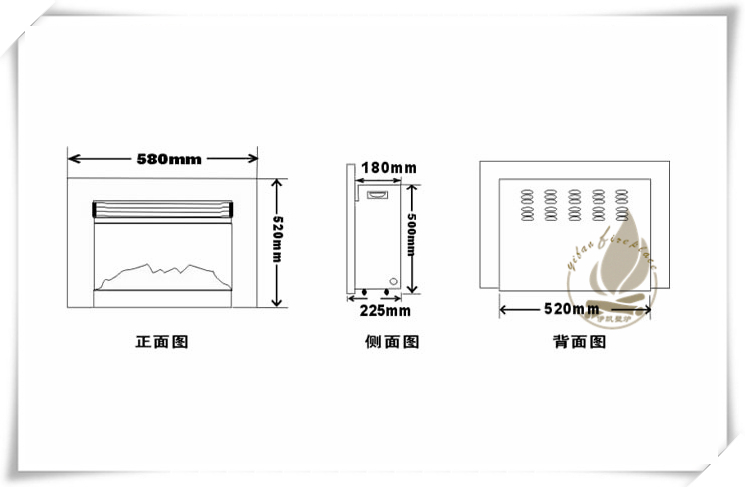 標(biāo)準(zhǔn)配置/standard layout | 電壁爐加厚冷軋鋼板/專用LED光源/加厚鋼化玻璃面/高仿真立體陶瓷纖維木柴炭火床/專用光學(xué)反射幕布 |